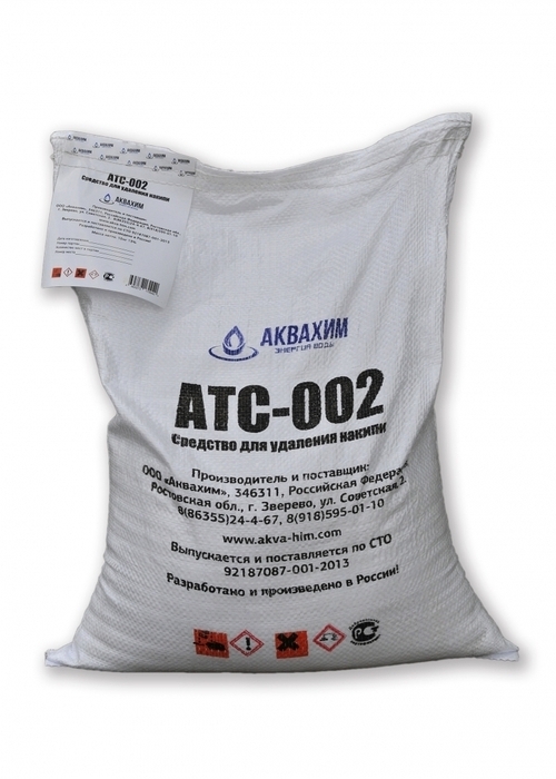 Средство для удаления отложений АТС-002 о.ж. – средство для удаления отложений состоящих из карбоната кальция с высоким содержанием оксидов железа (отложения от желтого до темно-коричневого цвета). Средство для удаления отложений «АТС®-002» – инновационное, экологически чистое, профессиональное средство для удаления всех видов отложений (накипи, ржавчины) на внутренних поверхностях теплоэнергетического оборудования: паровых и водогрейных котлах, пластинчатых и трубчатых теплообменниках всех типов, стальных и чугунных экономайзерах, выпарных установках, системах отопления «теплый пол», насосах всех видов. «АТС-002» о.ж. – средство для удаления отложений состоящих из карбоната кальция с высоким содержанием оксидов железа (отложения от желтого до темно коричневого цвета). Состав концентрированного средства «АТС-002»: активное вещество – отмывочный реагент широкого спектра действия на компоненты накипи; вспомогательные вещества – диспергаторы для трудноудаляемых видов накипи (с высокой плотностью) и продуктов микробиологической деятельности; ингибитор коррозии – пассиватор поверхностей из черных и цветных металлов и их сплавов (в т.ч. алюминия), который создаёт тонкую защитную пленку на поверхности металла. Таблица применения средства «АТС-002»: Необходимый объем моющего раствора Расход средств Температура воды Особенности применения 10 л «АТС-002» о.ж. от 0,6 до 1 кг В зависимости от типа и количества отложений: 20-40 0С Растворить расчетное количество средства:«АТС-002» в воде. Промывка осуществляется циркуляцией моющего раствора по всем трубам, каналам и ходам оборудования или системы отопления. Средство для удаления накипи с высоким содержанием оксидов железа (Мешок 10 кг) Характеристики: Основные Производитель Аквахим Страна производитель Россия